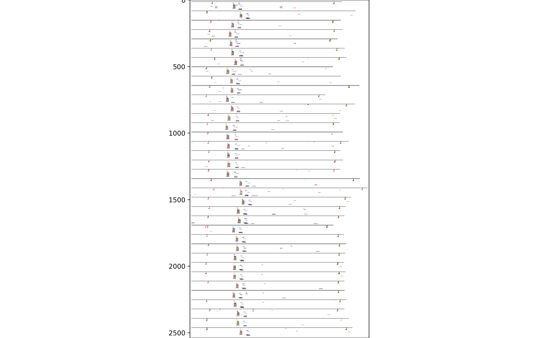 From this, there seem to be four common clusters of motifs: two short ones on the right and left edges, and a pair of consistently-space but shifted motifs in between. Looking at the top two, in more detail: